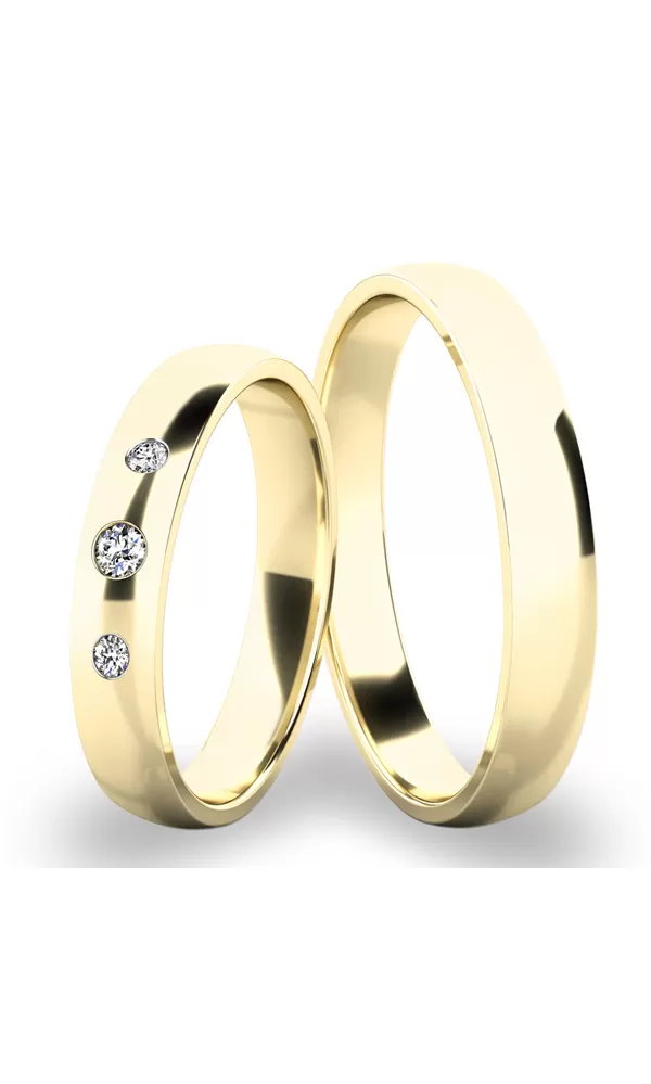 Svadobné prstene s polovičným profilom sú vyrobené zo žltých štrnástich -karátových zlatých 585/1000 v lesklom povrchu. Snubné prstene majú vnútorný fit profil - polovicu vnútornej strany pre príjemnejšie opotrebenie, nasadenie a odstránenie. V ženskom prsteňom sú tri okrúhle zirkóny s geniálnou grindovou hviezdou Signita, ktorá dáva zirkónom oslnivú brilanciu. Môžete mať aj diamanty v svadobných prsteňoch. Chlapci sú nastavení „na hladké“. Nastavenie zirkónov a diamantov vykonávajú naši najskúsenejší majstri zlatníci ručne pod mikroskopom, a preto neexistuje riziko padajúcich kameňov, ako je to v prípade strojových snubných prsteňov.