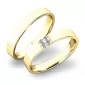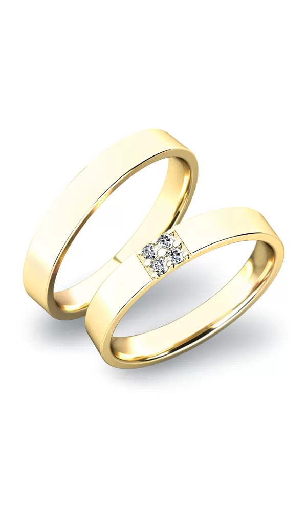 Jemné snubné prstene v rovnom profile sú vyrobené zo žltého štrnásťkarátového zlata 585/1000 v lesklej povrchovej úprave. Snubné prstene majú vnútorné Fit Profil - polguľatú vnútornú stranu pre príjemnejšie nosenie, nasadzovanie a odnímanie. V dámskom prsteni sú vsadené štyri okrúhle zirkóny s briliantovým brusom Signity star, ktorý dodáva zirkónom oslnivú brilanciu. Do snubných prsteňov si môžete nechať staviť aj diamanty. Kamene sú do prsteňa vsadené "do krapničiek". Vsadzovanie zirkónov aj diamantov vykonávajú naši najskúsenejší majstri zlatníci ručne pod mikroskopom s presnosťou na 0,01 mm a preto nehrozí vypadnutie kamienkov ako to býva u strojne vyrábaných snubných prsteňov.