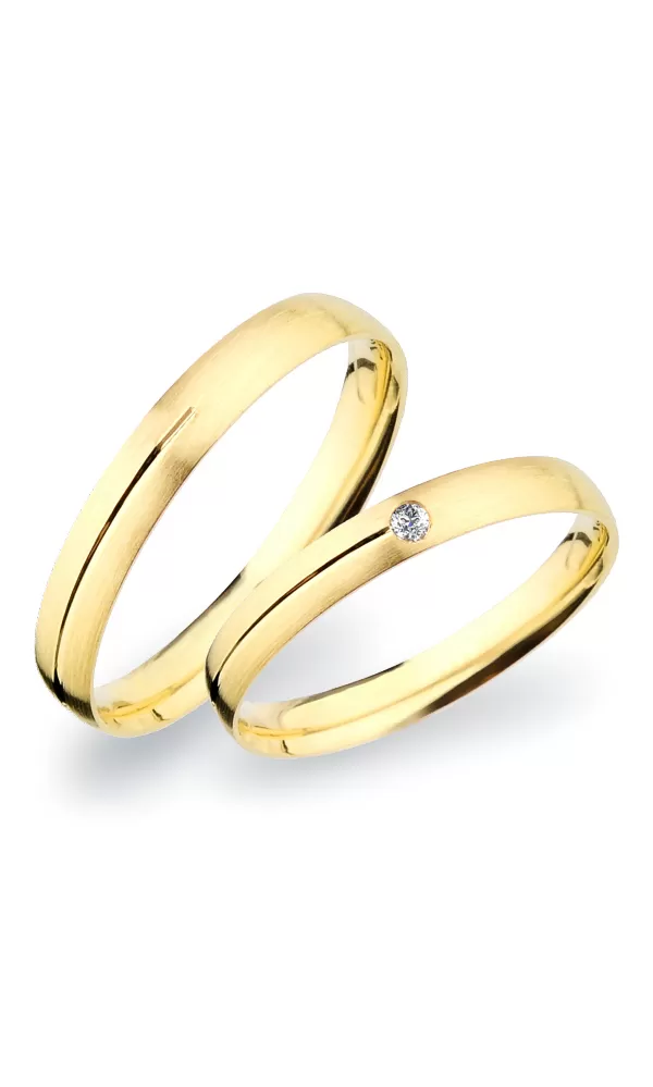 Snubné prstene mierne polguľatého profilu vyrobené zo žltého štrnásťkarátového zlata 585/1000 s matnou povrchovou úpravou - zamatový mat. Na prsteňoch je v polovici lesklá ryha vedená po polovici obvodu. Snubné prstene majú vnútorné Fit Profil - polguľatú vnútornú stranu pre príjemnejšie nosenie. V dámskom prsteni je vsadený jeden okrúhly zirkón s briliantovým brusom Signity star, ktorý dodáva zirkónu maximálnu brilanciu. Do snubných prsteňov si môžete nechať staviť aj diamant. Kameň je vsadený do prsteňa "na hladko". Vsadzovanie zirkónov aj diamantov vykonávajú naši najskúsenejší majstri zlatníci ručne pod mikroskopom s presnosťou na 0,01 mm a preto nehrozí vypadnutie kamienkov ako to býva u strojne vyrábaných snubných prsteňov. Snubné prstene je možné vyrobiť v ľubovoľných úpravách napr. vyrobiť snubné prstene užšie - nižšia cena alebo širšie - vyššia cena.