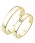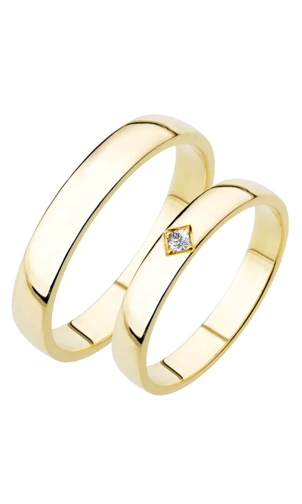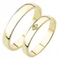 Zlaté snubné prstene zo žltého štrnásťkarátového zlata 585/1000 mierne polguľatého profilu s lesklou povrchovou úpravou. V dámskom prsteni je vsadený jeden okrúhly zirkón popr. diamant briliantového brusu. Snubné prstene je možné vyrobiť v rôznych šírkach napr. 4,00mm av rôznych povrchových úpravách napr. kombinácia lek - zamatový mat.