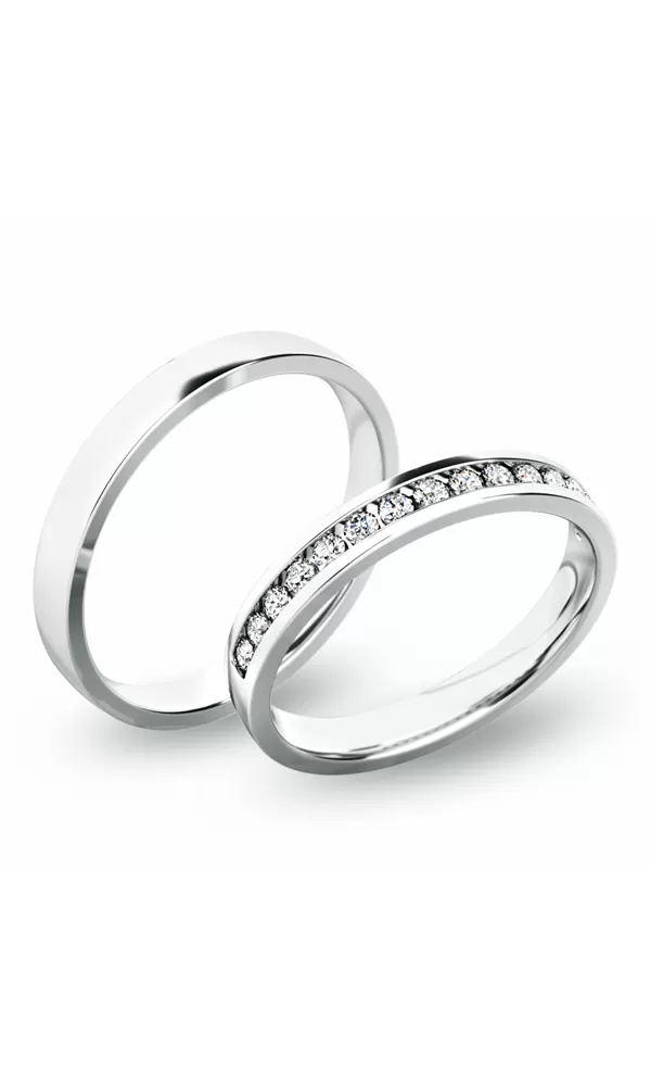 Snubné prstene mierne polguľatého profilu sú vyrobené zo žltého štrnásťkarátového zlata 585/1000 v lesklej povrchovej úprave. Snubné prstene majú vnútorné Fit Profil - polguľatú vnútornú stranu pre príjemnejšie nosenie, nasadzovanie a odnímanie. V dámskom prsteni je vsadených 15ks okrúhlych zirkónov s briliantovým brusom Signity star, ktorý dáva zirkónom oslnivú brilanciu. Do snubných prsteňov si môžete nechať staviť aj diamanty. Kamene sú vsadené do prsteňa "na hladko". Vsadzovanie zirkónov aj diamantov vykonávajú naši najskúsenejší majstri zlatníci ručne pod mikroskopom s presnosťou na 0,01 mm a preto nehrozí vypadnutie kamienkov ako to býva u strojne vyrábaných snubných prsteňov.
