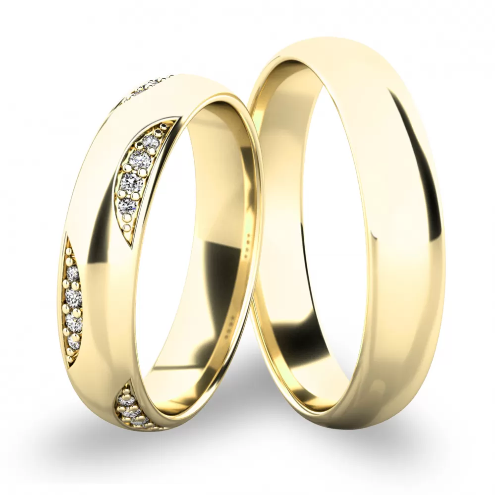 Elegantné snubné prstene polguľatého profilu sú vyrobené zo žltého štrnásťkarátového zlata 585/1000 v lesklej povrchovej úprave. Snubné prstene majú vnútorné Fit Profil - polguľatú vnútornú stranu pre príjemnejšie nosenie, nasadzovanie a odnímanie. V dámskom prsteni je vsadených 16 ks okrúhlych zirkónov s briliantovým brusom Signity star, ktorý dodáva zirkónom oslnivú brilanciu. Do snubných prsteňov si môžete nechať staviť aj diamanty. Kamene sú do prsteňa vsadené "do krapničiek". Vsadzovanie zirkónov aj diamantov vykonávajú naši najskúsenejší majstri zlatníci ručne pod mikroskopom s presnosťou na 0,01 mm a preto nehrozí vypadnutie kamienkov ako to býva u strojne vyrábaných snubných prsteňov.