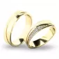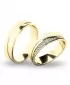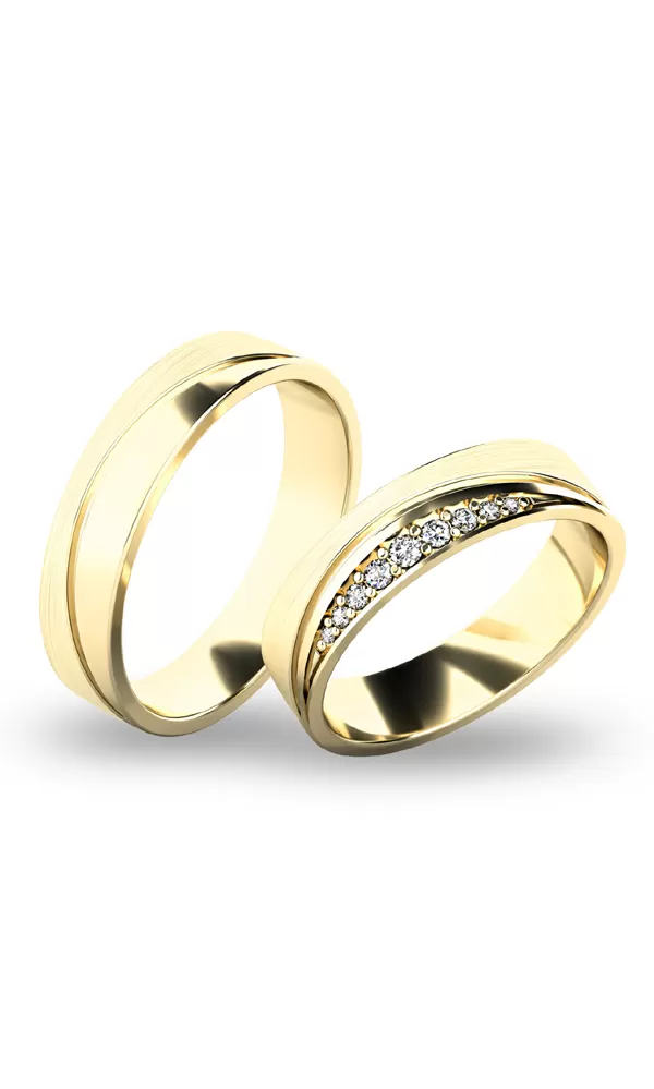 Moderné snubné prstene rovného profilu vyrobené zo žltého štrnásťkarátového zlata 585/1000 v kombinovanej povrchovej úprave lesk/mat. Snubné prstene majú vnútorné Fit Profil - polguľatú vnútornú stranu pre príjemnejšie nosenie, nasadzovanie a odnímanie. V dámskom prsteni je vsadených 9 ks okrúhlych zirkónov s briliantovým brusom Signity star, ktorý zaručuje zirkónom oslnivú brilanciu. Do snubných prsteňov si môžete nechať staviť aj diamanty. Kamene sú do prsteňa vsadené "do zrniek". Vsadzovanie zirkónov aj diamantov vykonávajú naši najskúsenejší majstri zlatníci ručne pod mikroskopom s presnosťou na 0,01 mm a preto nehrozí vypadnutie kamienkov ako to býva u strojne vyrábaných snubných prsteňov.