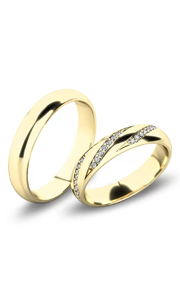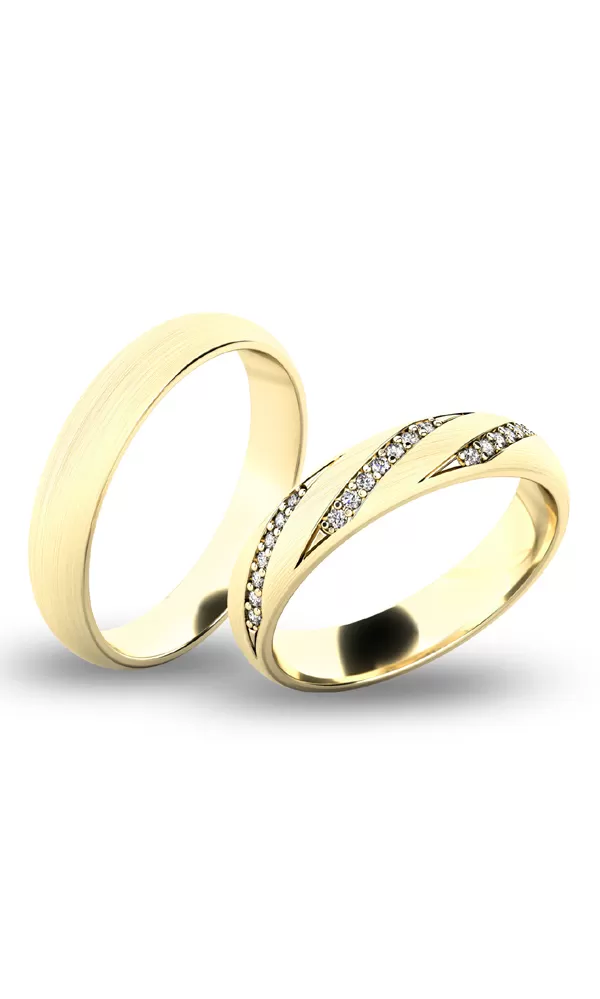 Krásne snubné prstene polguľatého profilu sú vyrobené zo žltého štrnásťkarátového zlata 585/1000 v lesklej povrchovej úprave. Snubné prstene majú vnútorné Fit Profil - polguľatú vnútornú stranu pre príjemnejšie nosenie, nasadzovanie a odnímanie. V dámskom prsteni je vsadených 21 ks okrúhlych zirkónov s briliantovým brusom Signity star, ktorý dodáva zirkónom oslnivú brilanciu. Do snubných prsteňov si môžete nechať staviť aj diamanty. Kamene sú do prsteňa vsadené "do krapničiek". Vsadzovanie zirkónov aj diamantov vykonávajú naši najskúsenejší majstri zlatníci ručne pod mikroskopom s presnosťou na 0,01 mm a preto nehrozí vypadnutie kamienkov ako to býva u strojne vyrábaných snubných prsteňov.