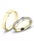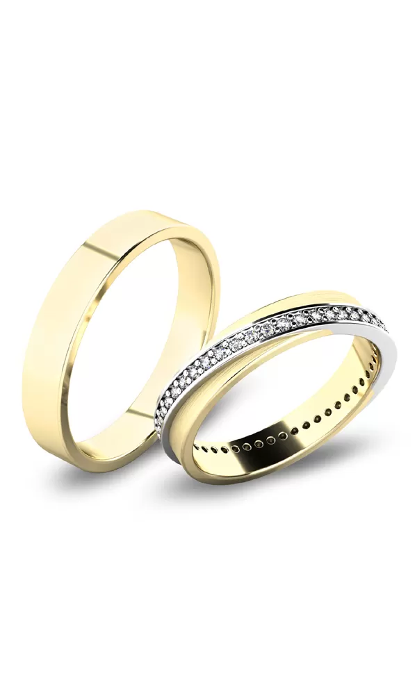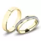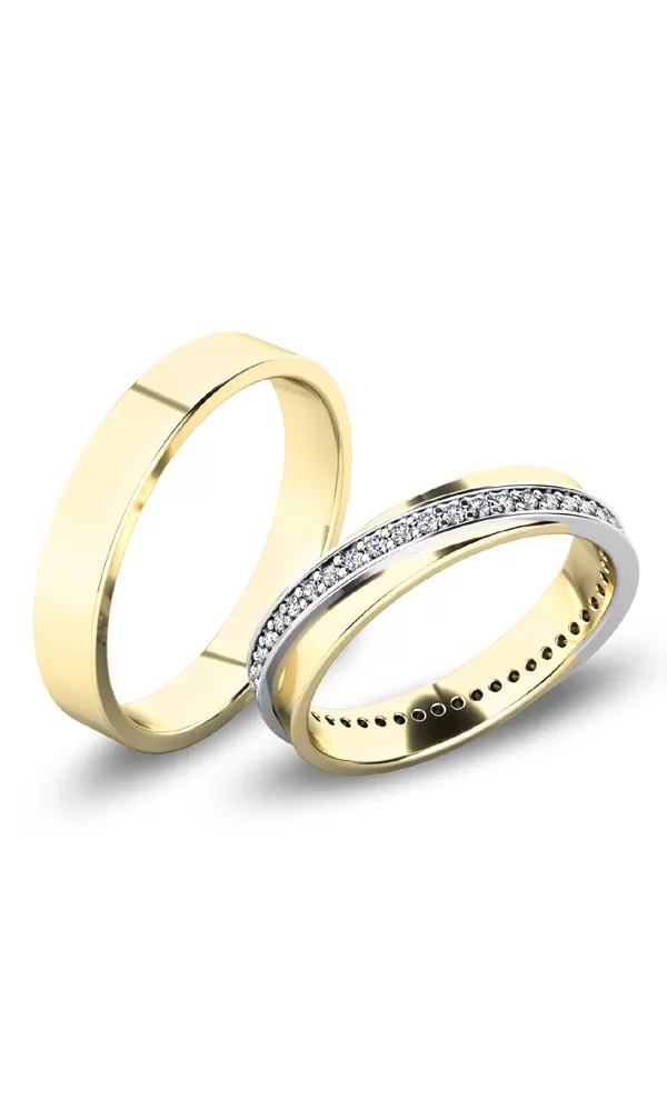Snubné prstene moderného dizajnu v rovnom profile sú vyrobené zo žltého štrnásťkarátového zlata 585/1000 v lesklej povrchovej úprave. Snubné prstene majú vnútorné Fit Profil - polguľatú vnútornú stranu pre príjemnejšie nosenie, nasadzovanie a odnímanie. Na dámskom prsteni je vystúpený prúžok, do ktorého je po celom obvode vsadených +/- 48 ks (podľa veľkosti) okrúhlych zirkónov s briliantovým brusom Signity star, ktorý dodáva zirkónom oslnivú brilanciu. Do snubných prsteňov si môžete nechať staviť aj diamanty. Kamene sú do prsteňa vsadené "do krapničiek". Vsadzovanie zirkónov aj diamantov vykonávajú naši najskúsenejší majstri zlatníci ručne pod mikroskopom s presnosťou na 0,01 mm a preto nehrozí vypadnutie kamienkov ako to býva u strojne vyrábaných snubných prsteňov.