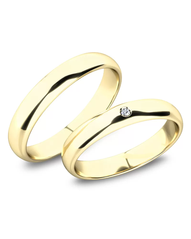 Obľúbené snubné prstene pologuľatého profilu vyrobené zo žltého štrnásťkarátového zlata 585/1000 v lesklej povrchovej úprave. V dámskom prsteni je vsadený jeden okrúhly zirkón s briliantovým brusom Signity star, ktorý dodáva zirkónu maximálnu brilanciu. Do snubných prsteňov si môžete nechať staviť aj diamant vybrúsený briliantovým brusom. Diamanty oplývajú svojou krásou a vlastnosťami, ktoré sú oproti iným kameňom bezkonkurenčné. Je to najtvrdší nerast, ktorý nikdy nestratí svoju hodnotu. Diamant je kráľ všetkých drahokamov a teda aj jedným z najcennejších a preto sa oplatí do šperkov s diamantmi investovať a predovšetkým pri snubných prsteňoch, ktoré sú na celý život! Kameň je vsadený do prsteňa "na hladko". Vsadzovanie zirkónov aj diamantov vykonávajú naši najskúsenejší majstri zlatníci ručne pod mikroskopom s presnosťou na 0,01 mm a preto nehrozí vypadnutie kamienkov ako to býva u strojne vyrábaných snubných prsteňov. Snubné prstene je možné vyrobiť v ľubovoľných úpravách napr. s viacerými kameňmi alebo vyrobiť snubné prstene užšie - nižšia cena alebo širšie - vyššia cena.