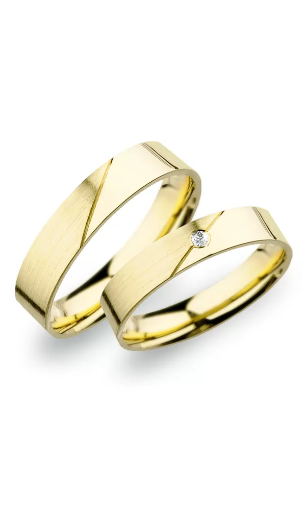 Snubné prstene rovného profilu vyrobené zo žltého štrnásťkarátového zlata 585/1000 s kombinovanou povrchovou úpravou lesk - zamatový mat, ktorý je oddelený šikmou ryhou. V dámskom prsteni je vsadený jeden okrúhly zirkón popr. diamant briliantového brusu. Snubné prstene je možné vyrobiť v rôznych farebných kombináciách zlata napr. žlto-biele alebo bielo-ružové. Ďalej je možné snubné prstene vyrobiť užšie alebo širšie.
