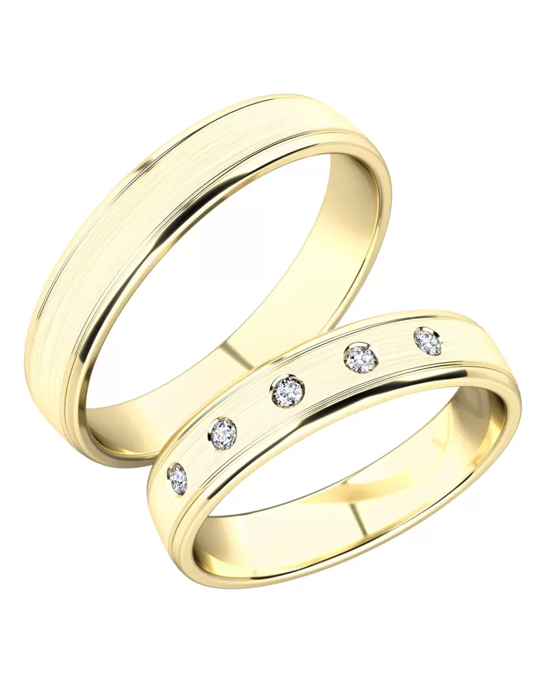 Snubné prstene vyrobené zo žltého štrnásťkarátového zlata 585/1000  mierne polguľatého profilu s vnútorným fit profilom - zaoblenie vnútornej strany pre príjemnejšie nosenie s kombinovanou povrchovou úpravou lesk - zamatový mat, ktorý je oddelený jemnými ryhami. V dámskom prsteni je vsadených päť okrúhlych zirkónov s briliantovým brusom Signity star, ktorý dodáva zirkónom oslnivú brilanciu. Do snubných prsteňov si môžete nechať staviť aj diamanty. Kamene sú do prsteňa vsadené "na hladko". Vsadzovanie zirkónov aj diamantov vykonávajú naši najskúsenejší majstri zlatníci ručne pod mikroskopom s presnosťou na 0,01 mm a preto nehrozí vypadnutie kamienkov ako to býva u strojne vyrábaných snubných prsteňov. Snubné prstene je možné vyrobiť v rôznych farebných kombináciách zlata as ľubovoľným počtom kameňov. Ďalej je možné snubné prstene urobiť užšie - nižšia cena alebo širšie - vyššia cena.