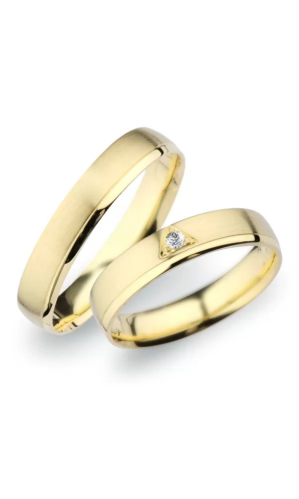 Snubné prstene vyrobené zo žltého štrnásťkarátového zlata 585/1000 mierne polguľatého profilu s vnútorným fit profilom - zaoblenie vnútornej strany pre príjemnejšie nosenie s kombinovanou povrchovou úpravou lesk - zamatový mat, ktorý je oddelený jemnou ryhou. V dámskom prstene. s briliantovým brusom Signity star, ktorý dodáva zirkónu maximálnu brilanciu. Do snubných prsteňov si môžete nechať vsadiť aj diamant. Kameň je vsadený do prsteňa "na hladko". vypadnutie kamienkov ako to býva u strojne vyrábaných snubných prsteňov. Snubné prstene je možné vyrobiť v rôznych farebných kombináciách zlata a s ľubovoľným počtom kameňov.
