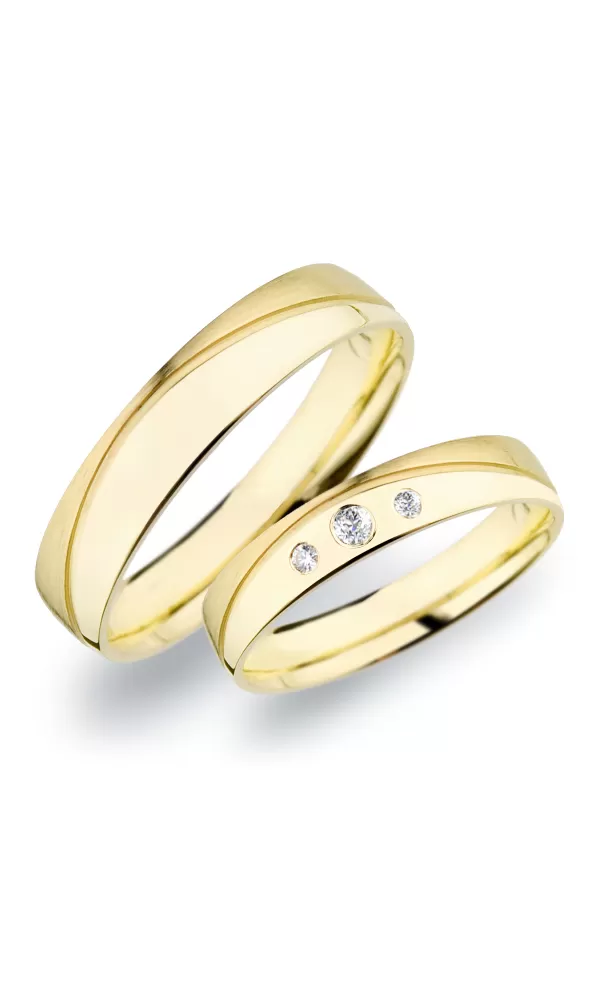 Snubné prstene zo štrnásťkarátového zlata 585/1000 v mierne polguľatom profile majú kombinovanou povrchovou úpravou lesk - zamatový mat s ryhou - vlnovkou, ktorá je vo vnútri matná. V dámskom prsteni sú vsadené tri okrúhle zirkóny popr. diamanty briliantového brusu. Snubné prstene majú vnútorný fit profil - zaoblenie vnútornej strany prsteňov. Snubné prstene je možné upraviť podľa vašich prianí napr. rôzne povrchové úpravy.