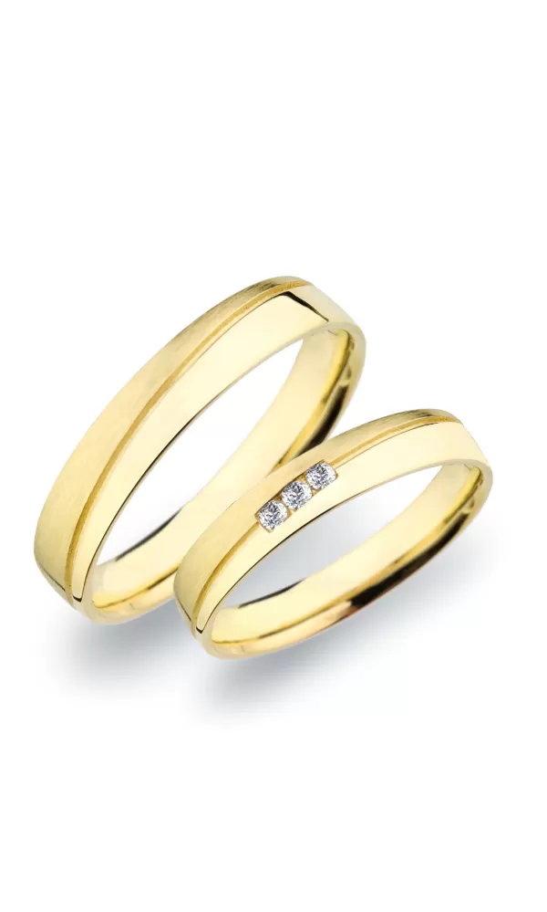 Snubné prstene zo štrnásťkarátového zlata 585/1000 v mierne polguľatom profile majú kombinovanou povrchovou úpravou lesk - zamatový mat s ryhou - vlnovkou, ktorá je vo vnútri matná. V dámskom prsteni sú vsadené tri okrúhle zirkóny popr. diamanty briliantového brusu. Snubné prstene majú vnútorný fit profil - zaoblenie vnútornej strany prsteňov. Snubné prstene je možné upraviť podľa vašich prianí napr. rôzne šírky a povrchové úpravy.