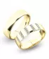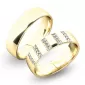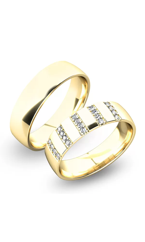 Snubné prstene v mierne polguľatom profile sú vyrobené zo žltého štrnásťkarátového zlata 585/1000 v lesklej povrchovej úprave. Snubné prstene majú vnútorné Fit Profil - polguľatú vnútornú stranu pre príjemnejšie nosenie, nasadzovanie a odnímanie. V dámskom prsteni je vsadených dvadsať okrúhlych zirkónov s briliantovým brusom Signity star, ktorý dodáva zirkónom oslnivú brilanciu. Do snubných prsteňov si môžete nechať staviť aj diamanty. Kamene sú do prsteňa vsadené "do zrniek".  Vsadzovanie vykonávajú naši najskúsenejší majstri zlatníci ručne pod mikroskopom s presnosťou na 0,01 mm a preto nehrozí vypadnutie kamienkov ako to býva u strojne vyrábaných snubných prsteňov.