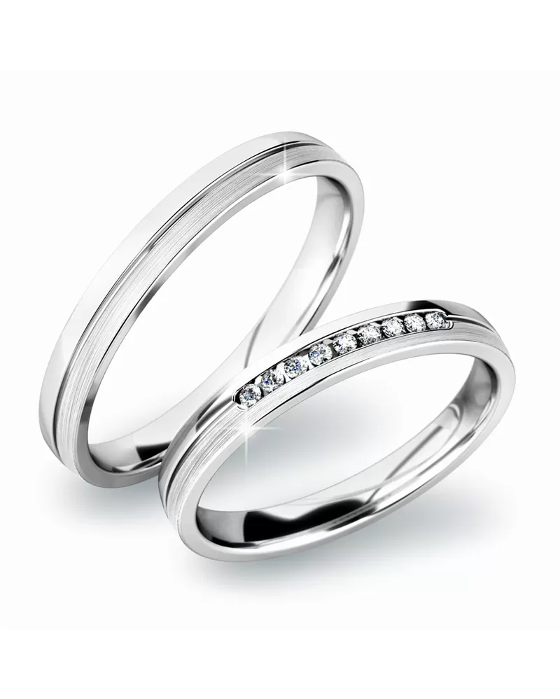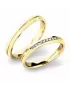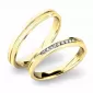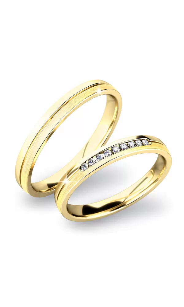 Jemné snubné prstene v mierne polguľatom profile sú vyrobené zo žltého štrnásťkarátového zlata 585/1000 v kombinácii lesklej a matnej povrchovej úpravy. Snubné prstene majú vnútorné Fit Profil - polguľatú vnútornú stranu pre príjemnejšie nosenie, nasadzovanie a odnímanie. V dámskom prsteni je vsadených deväť okrúhlych zirkónov s briliantovým brusom Signity star, ktorý dodáva zirkónom oslnivú brilanciu. Do snubných prsteňov si môžete nechať staviť aj diamanty. Kamene sú vsadené "na hladko - zatepaním". Vsadzovanie zirkónov aj diamantov vykonávajú naši najskúsenejší majstri zlatníci ručne pod mikroskopom a preto nehrozí vypadnutie kamienkov ako to býva u strojne vyrábaných snubných prsteňov.