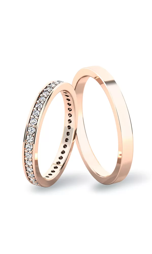 Snubné prstene mierne rovného profilu sú vyrobené zo žltého štrnásťkarátového zlata 585/1000 v lesklej povrchovej úprave. V dámskom prsteni je vsadené podľa veľkosti prsteňa 38ks okrúhlych zirkónov s briliantovým brusom Signity star, ktorý dodáva zirkónom oslnivú brilanciu. Do snubných prsteňov si môžete nechať staviť aj diamanty. Kamene sú do prsteňa vsadené "do zrniek". Vsadzovanie zirkónov aj diamantov vykonávajú naši najskúsenejší majstri zlatníci ručne pod mikroskopom a preto nehrozí vypadnutie kamienkov ako to býva u strojne vyrábaných snubných prsteňov.