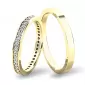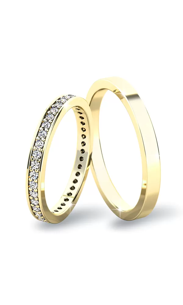 Snubné prstene mierne rovného profilu sú vyrobené zo žltého štrnásťkarátového zlata 585/1000 v lesklej povrchovej úprave. V dámskom prsteni je… Celý popis