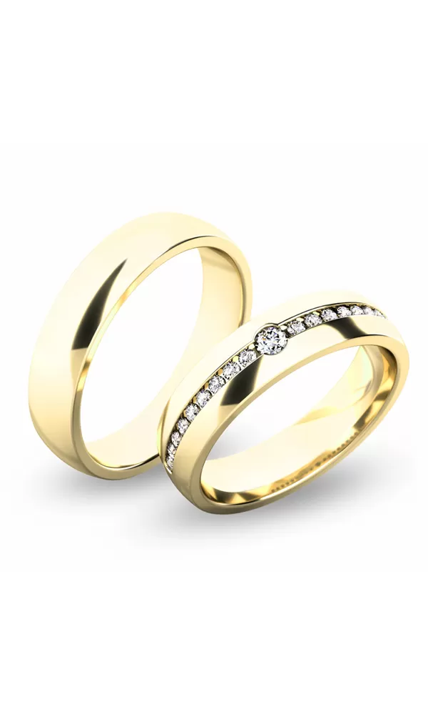 Snubné prstene v polguľatom profile sú vyrobené zo žltého štrnásťkarátového zlata 585/1000 v lesklej povrchovej úprave. Snubné prstene majú vnútorné Fit Profil - polguľatú vnútornú stranu pre príjemnejšie nosenie, nasadzovanie a odnímanie. V dámskom prsteni je vsadených 19ks okrúhlych zirkónov s briliantovým brusom Signity star, ktorý dodáva zirkónom oslnivú brilanciu. Do snubných prsteňov si môžete nechať staviť aj diamanty. Kamene sú do prsteňa vsadené "na hladko". Kamene sú do prsteňa vsadené "na hladko". Vsadzovanie vykonávajú naši najskúsenejší majstri zlatníci ručne pod mikroskopom s presnosťou na 0,01 mm a preto nehrozí vypadnutie kamienkov ako to býva u strojne vyrábaných snubných prsteňov.