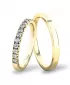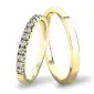 Jednoduché elegantné snubné prstene rovného profilu sú vyrobené zo žltého štrnásťkarátového zlata 585/1000 v lesklej povrchovej úprave. Snubné prstene majú vnútorné Fit Profil - polguľatú vnútornú stranu pre príjemnejšie nosenie, nasadzovanie a odnímanie. V dámskom prsteni je vsadených 13ks okrúhlych zirkónov s briliantovým brusom Signity star, ktorý dáva zirkónom oslnivú brilanciu. Do snubných prsteňov si môžete nechať staviť aj diamanty. Kamene sú do prsteňa vsadené "do krapničiek". Vsadzovanie zirkónov aj diamantov vykonávajú naši najskúsenejší majstri zlatníci ručne pod mikroskopom s presnosťou na 0,01 mm a preto nehrozí vypadnutie kamienkov ako to býva u strojne vyrábaných snubných prsteňov.