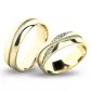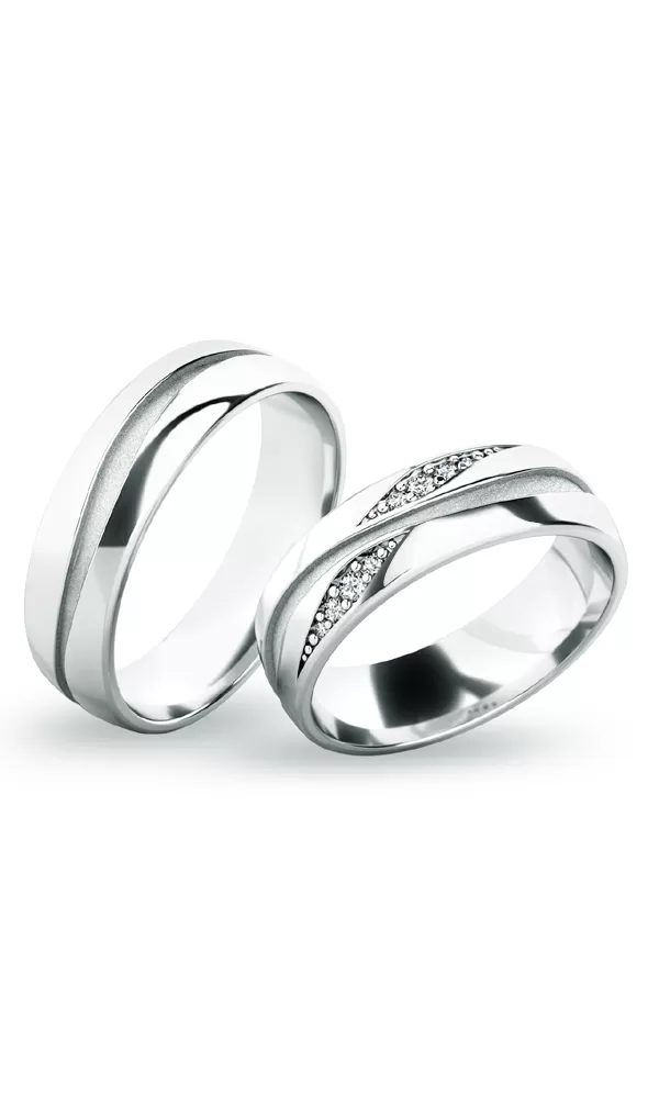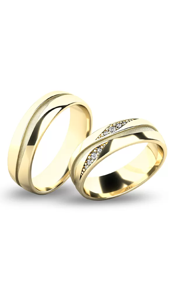 Moderné snubné prstene polguľatého profilu vyrobené zo žltého štrnásťkarátového zlata 585/1000 v kombinovanej povrchovej úprave lesk/pieskovanie, kedy do lesklých prsteňov je zapustená - vyfrézovaná vlnovka, ktorá je pieskovaná. Snubné prstene majú vnútorné Fit Profil - polguľatú vnútornú stranu pre príjemnejšie nosenie, nasadzovanie a odnímanie. V dámskom prsteni je vsadených 8 ks okrúhlych zirkónov s briliantovým brusom Signity star, ktorý zaručuje zirkónom oslnivú brilanciu. Do snubných prsteňov si môžete nechať staviť aj diamanty. Kamene sú do prsteňa vsadené "do krapničiek". Vsadzovanie zirkónov aj diamantov vykonávajú naši najskúsenejší majstri zlatníci ručne pod mikroskopom s presnosťou na 0,01 mm a preto nehrozí vypadnutie kamienkov ako to býva u strojne vyrábaných snubných prsteňov.