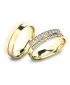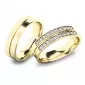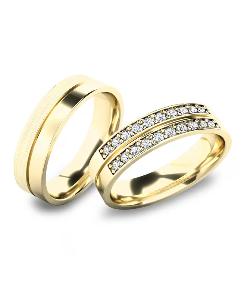 Luxusné snubné prstene v rovnom profile vyrobené zo žltého štrnásťkarátového zlata 585/1000 v lesklej povrchovej úprave. Snubné prstene majú vnútorné Fit Profil - polguľatú vnútornú stranu pre príjemnejšie nosenie, nasadzovanie a odnímanie. V dámskom prsteni je vsadených 20 ks okrúhlych zirkónov s briliantovým brusom Signity star, ktorý zaručuje zirkónom oslnivú brilanciu. Do snubných prsteňov si môžete nechať staviť aj diamanty. Kamene sú do prsteňa vsadené "do krapničiek". Vsadzovanie zirkónov aj diamantov vykonávajú naši najskúsenejší majstri zlatníci ručne pod mikroskopom s presnosťou na 0,01 mm a preto nehrozí vypadnutie kamienkov ako to býva u strojne vyrábaných snubných prsteňov.