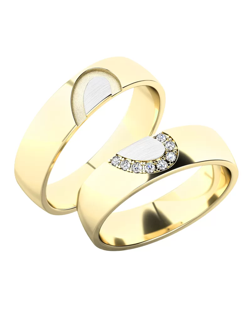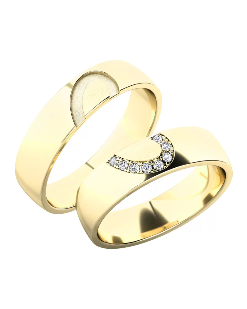 Luxusné snubné prstene v mierne pologuľatom profile vyrobené zo žltého štrnásťtikarátového zlata 585/1000 v kombinovanej povrchovej úprave leskl - mat. Kedy obrúčka prsteňov je lesklá, stred srdiečka je zamatovo matný, na pánskom prsteni je kontúra srdiečka pieskovaná av dámskom prsteni je vsadených 8 ks okrúhlych zirkónov s briliantovým brusom Signity star, ktorý zaručuje zirkónom maximálnu brilanciu. Do snubných prsteňov si môžete nechať staviť aj diamanty s briliantovým brusom. Diamanty oplývajú svojou krásou a vlastnosťami, ktoré sú oproti iným kameňom bezkonkurenčné. Je to najtvrdší nerast, ktorý nikdy nestratí svoju hodnotu. Diamant je kráľ všetkých drahokamov a teda aj jedným z najcennejších a preto sa oplatí do šperkov s diamantmi investovať a predovšetkým pri snubných prsteňoch, ktoré sú na celý život! Kamene sú do prsteňa vsadené "do krapničiek". Vsadzovanie zirkónov aj diamantov vykonávajú naši najskúsenejší majstri zlatníci ručne pod mikroskopom s presnosťou na 0,01 mm a preto nehrozí vypadnutie kamienkov ako to býva u strojne vyrábaných snubných prsteňov. Snubné prstene majú vnútorné Fit Profil - polguľatú vnútornú stranu pre príjemnejšie nosenie, nasadzovanie a odnímanie.