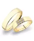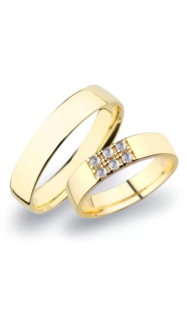 Snubné prstene rovného profilu vyrobené zo žltého štrnásťkarátového zlata 585/1000 v lesklej povrchovej úprave. Snubné prstene majú vnútorné Fit Profil - polguľatú vnútornú stranu pre príjemnejšie nosenie. V dámskom prsteni je vsadených šesť okrúhlych zirkónov popr. diamantov briliantového brúsu.