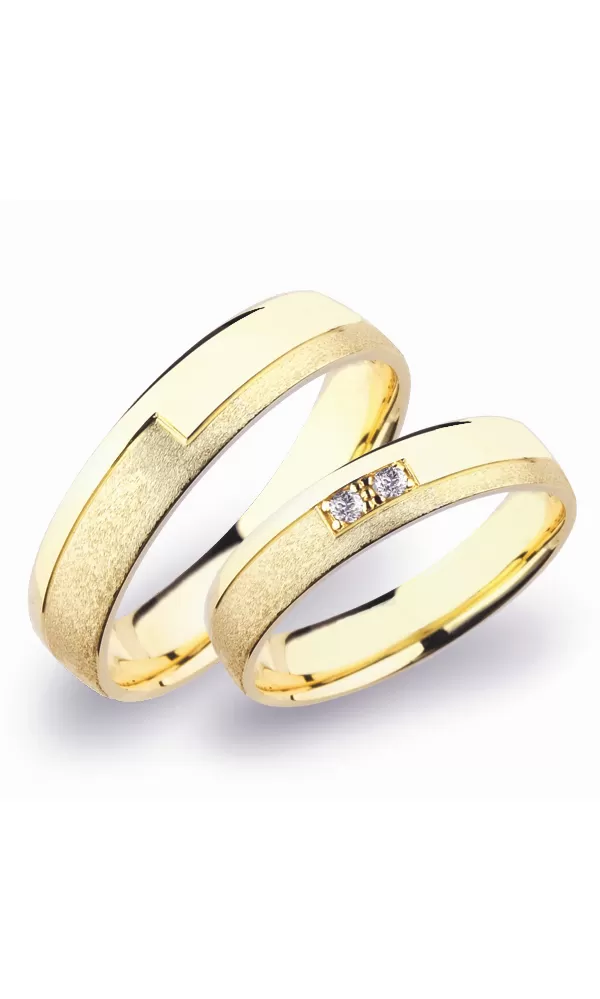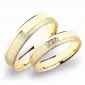 Snubné prstene polguľatého profilu vyrobené zo žltého štrnásťkarátového zlata 585/1000 v kombinovanej povrchovej úprave lesk - diamantové brúsenie. Snubné prstene majú vnútorné Fit Profil - polguľatú vnútornú stranu pre príjemnejšie nosenie, nasadzovanie a odnímanie. V dámskom prsteni sú vsadené dva okrúhle zirkóny popr. diamanty briliantového brúsu.