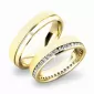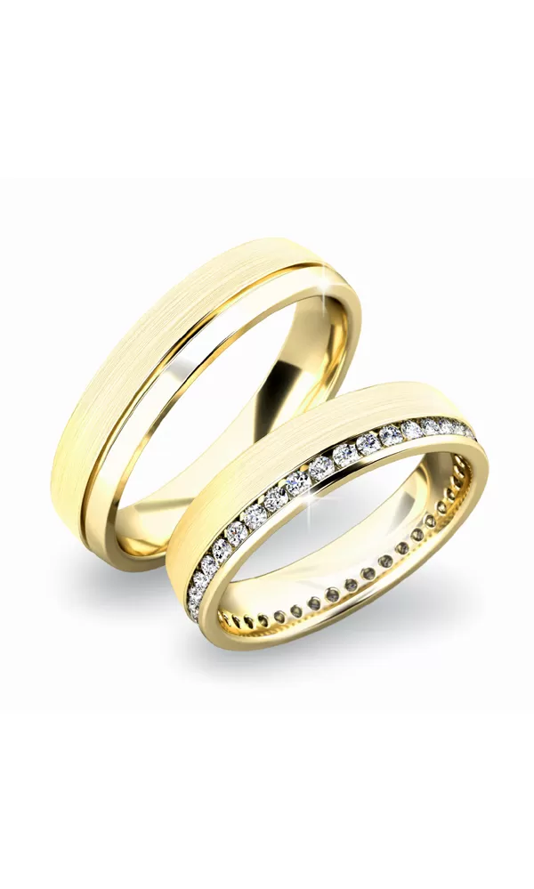 Luxusné snubné prstene v mierne polguľatom profile sú vyrobené zo žltého štrnásťkarátového zlata 585/1000 v kombinácii lesklej a matnej povrchovej úpravy. Snubné prstene majú vnútorné Fit Profil - polguľatú vnútornú stranu pre príjemnejšie nosenie, nasadzovanie a odnímanie. V dámskom prsteni je vsadených po celom obvode štyridsať okrúhlych zirkónov s briliantovým brusom Signity star, ktorý dodáva zirkónom oslnivú brilanciu. Do snubných prsteňov si môžete nechať staviť aj diamanty. Kamene sú do prsteňa vsadené "na hladko - zatepaním". Vsadzovanie zirkónov aj diamantov vykonávajú naši najskúsenejší majstri zlatníci ručne pod mikroskopom s presnosťou na 0,01 mm a preto nehrozí vypadnutie kamienkov ako to býva u strojne vyrábaných snubných prsteňov.