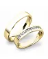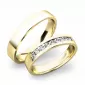 Veľmi obľúbené snubné prstene v mierne polguľatom profile sú vyrobené zo žltého štrnásťkarátového zlata 585/1000 v lesklej povrchovej úprave. Snubné prstene majú vnútorné Fit Profil - polguľatú vnútornú stranu pre príjemnejšie nosenie, nasadzovanie a odnímanie. V dámskom prsteni je vsadených deväť okrúhlych zirkónov s briliantovým brusom Signity star, ktorý dodáva zirkónom oslnivú brilanciu. Do snubných prsteňov si môžete nechať staviť aj diamanty. Kamene sú do prsteňa vsadené "na hladko - zatepaním". Vsadzovanie zirkónov aj diamantov vykonávajú naši najskúsenejší majstri zlatníci ručne pod mikroskopom s presnosťou na 0,01 mm a preto nehrozí vypadnutie kamienkov ako to býva u strojne vyrábaných snubných prsteňov.