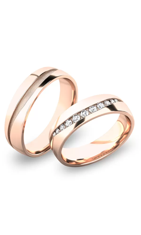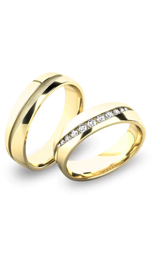 Krásne moderné snubné prstene vyrobené zo štrnásťkarátového zlata 585/1000 v mierne polguľatom profile. Po celom obvode prsteňa je zapustený žliabok v tvare vlnovky, ktorý je matný - pieskovaný a kraje sú lesklé alebo je možné kombinovať mat a lesk lesklý a jeden matný - zamatový mat. je vsadené v hornej časti jedenásť okrúhlych zirkónov popr. diamantov briliantového brusu v rôznych veľkostiach tak, že vypĺňajú asymetrickú vlnovku. prsteňov.