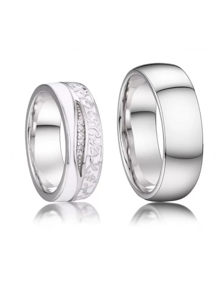 Moderné strieborné snubné prstene v mierne polguľatom profile vyrobené zo striebra 925/1000. Povrch dámskeho prsteňa je potiahnutý bielym smaltom a zdobený jemným strieborným motívom av prsteni je vsadené po obvode 6 okrúhlych zirkónov s briliantovým brusom Signity star, ktorý dodáva zirkónom maximálnu brilanciu. Pánsky prsteň má povrch vo vysokom lesku. Prstene majú vnútorný fit profil - zaoblenú vnútornú stranu pre príjemnejšie nosenie, nasadzovanie a odnímanie.