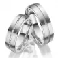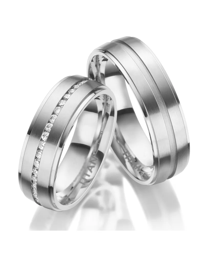 Pánský prsten zdobí snížené okraje ve vysokém lesku a středový snížený proužek zvýrazněn pískováním. Dámský prsten navíc zdobí zirkony vsazeny kolem celé obvodu prstenu. Zirkony jsou v briliantovém brusu Signity star, který dodává zirkonům maximální brilanci. Snubní prsteny mají vnitřní Fit Profil – půlkulatou vnitřní stranu pro příjemnější nošení, nasazování a sundávání.