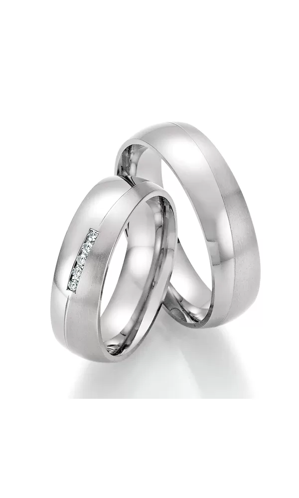 Elegantné titánové snubné prstene v mierne polguľatom profile s kombinovanou povrchovou úpravou zamatový mat – lesk. Kedy sú prúžky oddelené jemnou ryhou. V dámskom prsteni je vsadených päť okrúhlych diamantov briliantového výbrusu.  Diamanty vynikajú svojou krásou a vlastnosťami, ktoré sú oproti iným kameňom bezkonkurenčné. Je to najtvrdší nerast, ktorý nikdy nestratí svoju hodnotu. Diamant je kráľ všetkých drahokamov a teda aj jedným z najcennejších a preto sa oplatí do šperkov s diamantmi investovať a predovšetkým pri snubných prsteňoch, ktoré sú na celý život! Vsadzovanie diamantov vykonávajú naši najskúsenejší majstri zlatníci ručne pod mikroskopom s presnosťou na 0,01 mm a preto nehrozí vypadnutie kamienkov ako to býva u strojne vyrábaných snubných prsteňov. Snubné prstene majú vnútorný fit profil - zaoblenie vnútornej strany prsteňov pre príjemnejšie nosenie, nasadzovanie a odnímanie prsteňov.