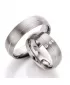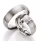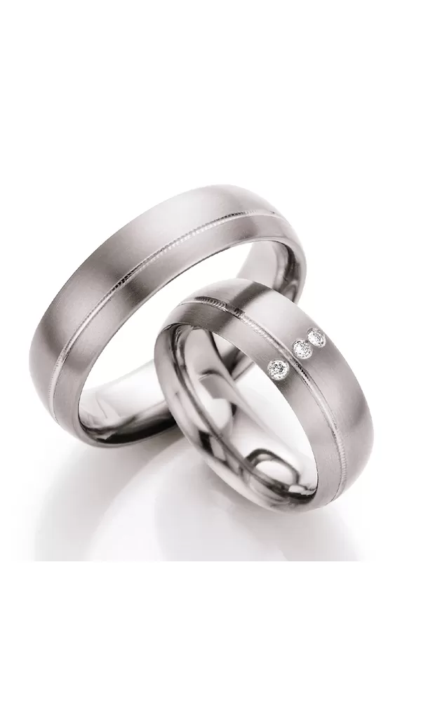 Široké titánové snubné prstene polguľatého profilu s matnou povrchovou úpravou a lesklou ryhou. V dámskom prsteni sú vsadené tri okrúhle diamanty… Celý popis