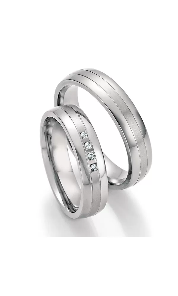 Elegantné titánové snubné prstene v mierne polguľatom profile s kombinovanou povrchovou úpravou zamatový mat – lesk. Kedy matný prúžok uprostred je zvýraznený jemnými ryhami. V dámskom prsteni sú vsadené štyri okrúhle diamanty briliantového výbrusu. Diamanty vynikajú svojou krásou a vlastnosťami, ktoré sú oproti iným kameňom bezkonkurenčné. Je to najtvrdší nerast, ktorý nikdy nestratí svoju hodnotu. Diamant je kráľ všetkých drahokamov a teda aj jedným z najcennejších a preto sa oplatí do šperkov s diamantmi investovať a predovšetkým pri snubných prsteňoch, ktoré sú na celý život! Vsadzovanie diamantov vykonávajú naši najskúsenejší majstri zlatníci ručne pod mikroskopom s presnosťou na 0,01 mm a preto nehrozí vypadnutie kamienkov ako to býva u strojne vyrábaných snubných prsteňov. Snubné prstene majú vnútorný fit profil - zaoblenie vnútornej strany prsteňov pre príjemnejšie nosenie, nasadzovanie a odnímanie prsteňov.