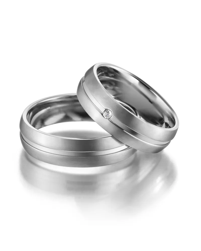 Luxusné snubné prstene z titánu polguľatého profilu v kombinácii lesklého a zamatovo matovanému povrchu. Prsteň sa skladá z troch častí, kde sú strany matné a prostredná časť lesklá. Dámsky prsteň je osadený okrúhlym zirkónom s briliantovým brusom Signity star, ktorý dodáva zirkónom maximálnu brilanciu. Prstene majú vnútorný fit profil - zaoblenú vnútornú stranu pre príjemnejšie nosenie, nasadzovanie a odnímanie.