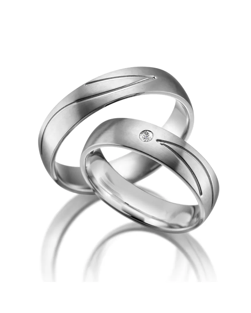 Luxusné snubné prstene z titánu mierne polguľatého profilu v zamatovo matovanom povrchu. Prstene zdobí asymetrická matná ryha, ktorá je iba na prednej strane prsteňa a ďalej už nepokračuje. Dámsky prsteň je osadený okrúhlym zirkónom s briliantovým brusom Signity star, ktorý dodáva zirkónom maximálnu brilanciu. Prstene majú vnútorný fit profil - zaoblenú vnútornú stranu pre príjemnejšie nosenie, nasadzovanie a odnímanie.