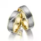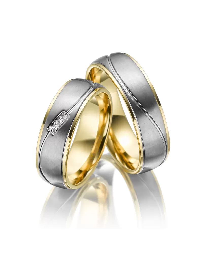 Luxusné snubné prstene z titánu mierne polguľatého profilu v kombinácii lesklej a zamatovo matnej povrchovej úpravy. Kraje prsteňa sú pozlátené technológiou PVD v lesklej povrchovej úprave. Prsteň je zdobený matnou vlnkou. Vlnka je v dámskom prsteni osadená troma okrúhlymi zirkónmi s briliantovým brusom Signity star, ktorý dodáva zirkónom maximálnu brilanciu. Prstene majú vnútorný fit profil - zaoblenú vnútornú stranu pre príjemnejšie nosenie, nasadzovanie a odnímanie.