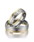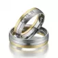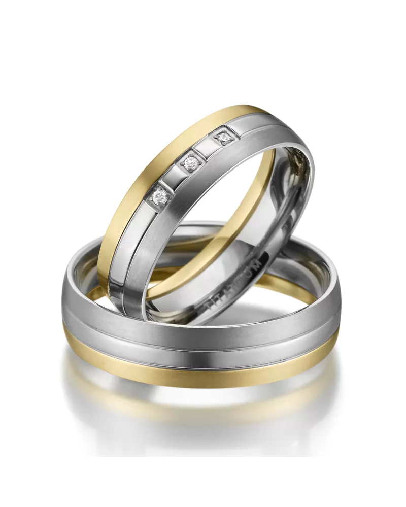 Moderné dvojfarebné prevedenie! Titánové snubné prstene mierne polguľatého profilu s kombinovanou povrchovou úpravou vysoký lesk a mat. Navyše sú prstene pozlátené technológiou PVD vo farbe žltého zlata. Prstene sú na tri vodorovné línie, kedy jedna je pozlátená matná, potom uprostred lesklá titánová časť a potom zamatovo matná časť. Dámsky prsteň je osadený v lesklej časti tromi žiarivými zirkónmi s briliantovým brusom Signity star, ktorý dodáva zirkónom maximálnu brilanciu. Prstene majú vnútorný fit profil - zaoblenú vnútornú stranu pre príjemnejšie nosenie, nasadzovanie a odnímanie.