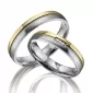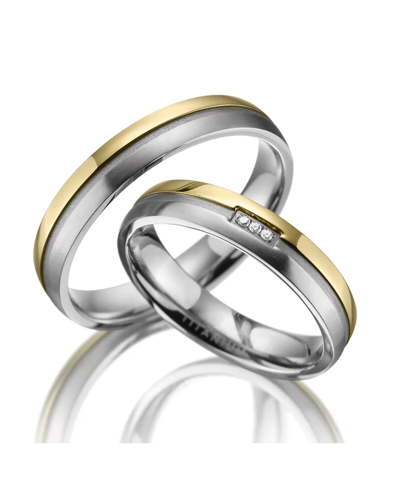 Moderné dvojfarebné prevedenie! Titánové snubné prstene mierne polguľatého profilu s kombinovanou povrchovou úpravou vysoký lesk a mat. Navyše sú prstene pozlátené technológiou PVD vo farbe žltého zlata. Prstene majú jednu časť pozlátenú v lesku a druhú časť v zamatovom mate. Tieto časti sú od seba oddelené výraznou matnou ryhou. Dámsky prsteň je osadený v tejto ryhe tromi žiarivými zirkónmi s briliantovým brusom Signity star, ktorý dodáva zirkónom maximálnu brilanciu. Prstene majú vnútorný fit profil - zaoblenú vnútornú stranu pre príjemnejšie nosenie, nasadzovanie a odnímanie.