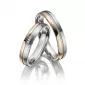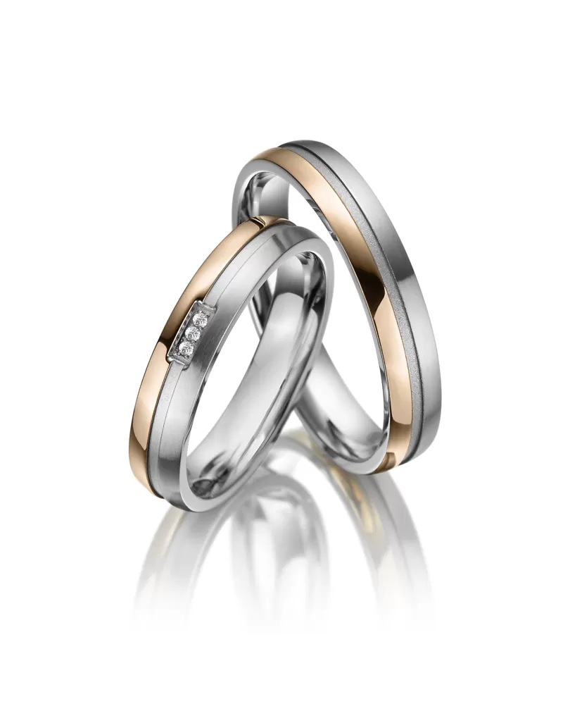 Moderné dvojfarebné prevedenie! Titánové snubné prstene mierne polguľatého profilu s kombinovanou povrchovou úpravou vysoký lesk a mat. Navyše sú prstene pozlátené technológiou PVD vo farbe ružového zlata. Prstene majú jednu časť pozlátenú v lesku a druhú časť v zamatovom mate. Tieto časti sú od seba oddelené výraznou matnou ryhou. Dámsky prsteň je osadený v tejto ryhe tromi žiarivými zirkónmi s briliantovým brusom Signity star, ktorý dodáva zirkónom maximálnu brilanciu. Prstene majú vnútorný fit profil - zaoblenú vnútornú stranu pre príjemnejšie nosenie, nasadzovanie a odnímanie.