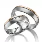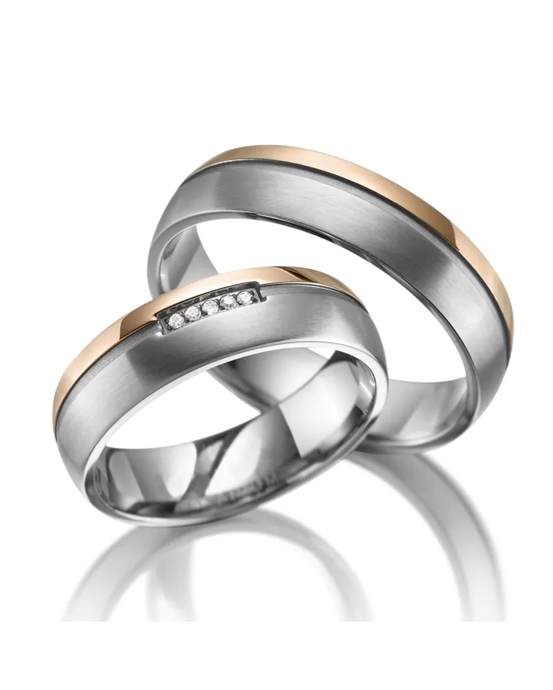 Moderné dvojfarebné prevedenie! Titánové snubné prstene mierne polguľatého profilu s kombinovanou povrchovou úpravou vysoký lesk a mat. Navyše sú prstene pozlátené technológiou PVD vo farbe ružového zlata. Prstene majú užšiu časť pozlátenú v lesku a druhú väčšiu časť v zamatovom mate. Tieto časti sú od seba oddelené výraznou matnou ryhou. Dámsky prsteň je osadený v tejto ryhe piatimi žiarivými zirkónmi s briliantovým brusom Signity star, ktorý dodáva zirkónom maximálnu brilanciu. Prstene majú vnútorný fit profil - zaoblenú vnútornú stranu pre príjemnejšie nosenie, nasadzovanie a odnímanie.