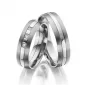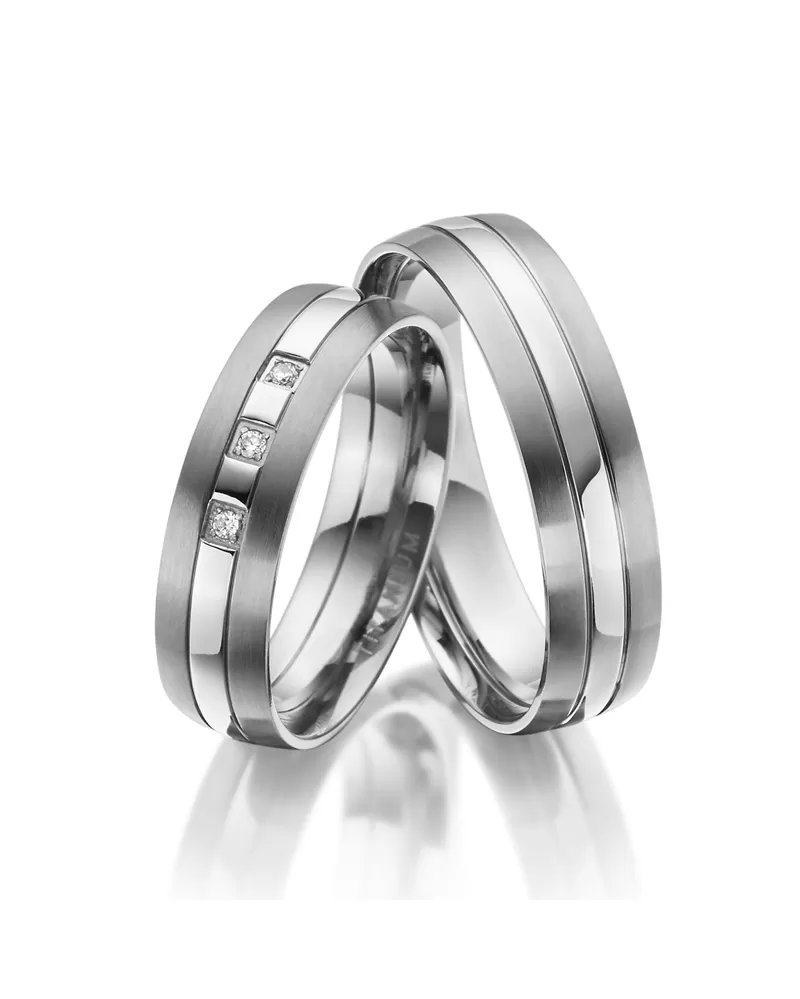 Titanové snubné prstene mierne polguľatého profilu s kombinovanou povrchovou úpravou lesk a mat. Prstene sú na tri vodorovné línie, kedy je prostredná časť lesklá a kraja v zamatovom matu. Dámsky prsteň je osadený v lesklej časti troma okrúhlymi zirkónmi s briliantovým brusom Signity star, ktorý dodáva zirkónom maximálnu brilanciu. Prstene majú vnútorný fit profil - zaoblenú vnútornú stranu pre príjemnejšie nosenie, nasadzovanie a odnímanie.