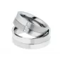Snubné prstene z titánu v mierne polguľatom profile s kombinovanou povrchovou úpravou lesk - zamatový mat, kedy je lesklý prúžok oddelený jemnou ryhou. V dámskom prsteni sú vsadené tri okrúhle zirkóny s briliantovým brusom Signity star, ktorý dodáva zirkónom maximálnu brilanciu. Prstene majú vnútorný fit profil - zaoblenú vnútornú stranu pre príjemnejšie nosenie, nasadzovanie a odnímanie.