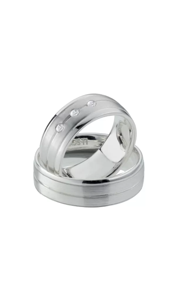 Snubné prstene z titánu v mierne polguľatom profile s kombinovanou povrchovou úpravou lesk - zamatový mat, kedy sú lesklé prúžky oddelené jemnými ryhami.  V dámskom prsteni sú vsadené tri okrúhle zirkóny s briliantovým brusom vnútorný fit profil - zaoblenú vnútornú stranu pre príjemnejšie nosenie, nasadzovanie a odnímanie.