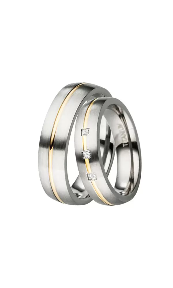Snubné prstene z titánu v mierne polguľatom profile s kombinovanou povrchovou úpravou lesk - zamatový mat, uprostred sú lesklé prúžky s PVD pozlátením.  V dámskom prsteni sú do štvorčeka vsadené tri okrúhle zirkóny s briliantovým brusom Signity star, ktorý dodáva zirkónom maximálnu brilanciu. Prstene majú vnútorný fit profil - zaoblenú vnútornú stranu pre príjemnejšie nosenie, nasadzovanie a odnímanie.