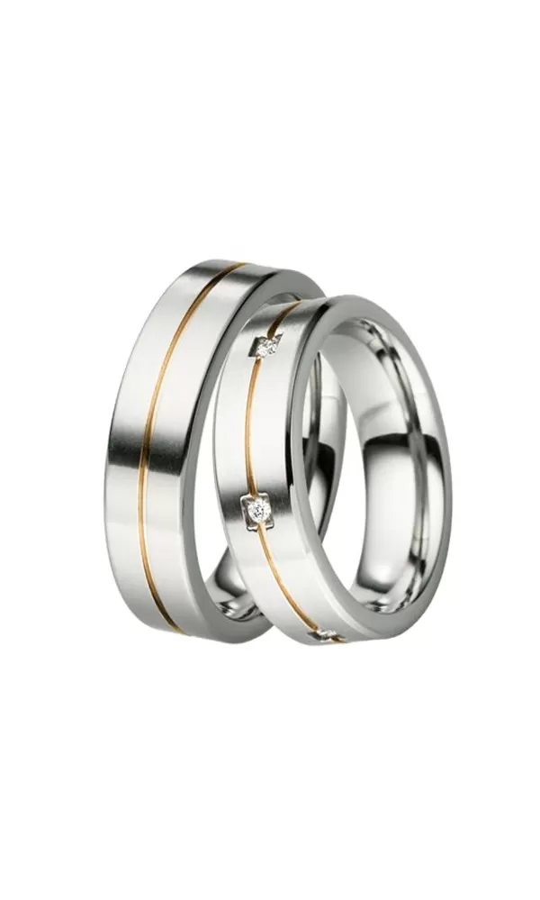 Snubné prstene z titánu v mierne polguľatom profile s matnou povrchovou úpravou s lesklými ryhami s PVD pozlátením. V dámskom prsteni je do štvorčeka vsadených šesť okrúhlych zirkónov s briliantovým brusom Signity star, ktorý dodáva zirkónom maximálnu brilanciu. Prstene majú vnútorný fit profil - zaoblenú vnútornú stranu pre príjemnejšie nosenie, nasadzovanie a odnímanie.