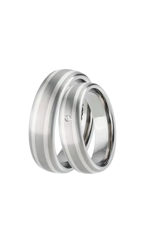Snubné prstene z titánu v mierne polguľatom profile s matnou povrchovou. Prstene majú uprostred dva strieborné prúžky. V dámskom prsteni je vsadený jeden okrúhly zirkón s briliantovým brusom Signity star, ktorý dodáva zirkónom maximálnu brilanciu. Prstene majú vnútorný fit profil - zaoblenú vnútornú stranu pre príjemnejšie nosenie, nasadzovanie a odnímanie.