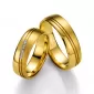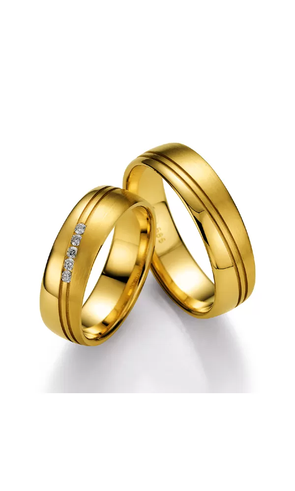 Luxusné zlaté snubné prstene vyrobené zo štrnásťkarátového žltého zlata - 585/000 v mierne polguľatom profile v kombinovanej povrchovej úprave zamatový mat - lesk s vlnovkou, v ktorej je v dámskom prsteni briliantového brusu. Diamanty oplývajú svojou krásou a vlastnosťami, ktoré sú oproti iným kameňom bezkonkurenčné. Je to najtvrdší nerast, ktorý nikdy nestratí svoju hodnotu. Diamant je kráľ všetkých drahokamov a teda aj jedným z najcennejších a preto sa oplatí do šperkov s diamantmi investovať a predovšetkým pri snubných prsteňoch, ktoré sú na celý život! Vsadzovanie diamantov vykonávajú naši najskúsenejší majstri zlatníci ručne pod mikroskopom s presnosťou na 0,01 mm a preto nehrozí vypadnutie kamienkov ako to býva u strojne vyrábaných snubných prsteňov. Snubné prstene majú vnútorný fit profil - zaoblenie vnútornej strany prsteňov pre príjemnejšie nosenie.