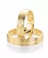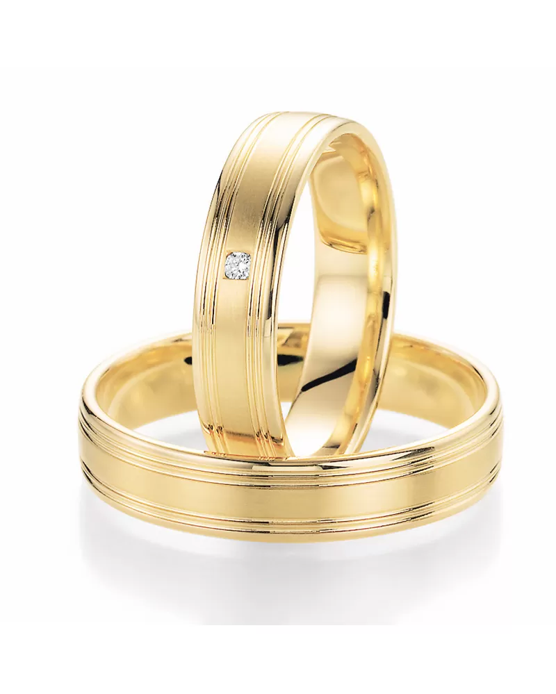 Snubné prstene zo žltého zlata s diamantom. Rýdzosť zlata je 585/1000 - štrnásť karátov vo veľmi miernom polguľatom profile v kombinovanej povrchovej… Celý popis