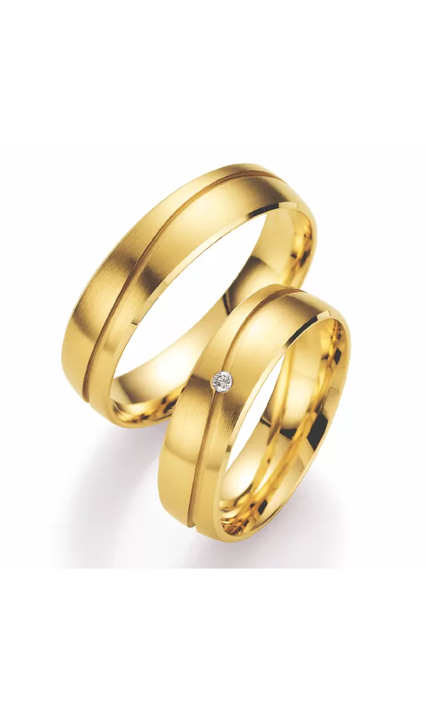 Zlaté snubné prstene vyrobené zo štrnásťkarátového žltého zlata - 585/000 v mierne polguľatom profile v matnej povrchovej úprave s vlnovkou, v ktorej je v dámskom prsteni vsadený jeden guľatý. oplývajú svojou krásou a vlastnosťami, ktoré sú oproti iným kameňom bezkonkurenčné. Je to najtvrdší nerast, ktorý nikdy nestratí svoju hodnotu. ktoré sú na celý život! Vsadzovanie diamantov vykonávajú naši najskúsenejší majstri zlatníci ručne pod mikroskopom s presnosťou na 0,01mm a preto nehrozí vypadnutie kamienkov ako to býva u strojne vyrábaných snubných prsteňov. Snubné prstene majú vnútorný fit profil - zaoblenie vnútornej strany prsteňov pre príjemnejšie nosenie.